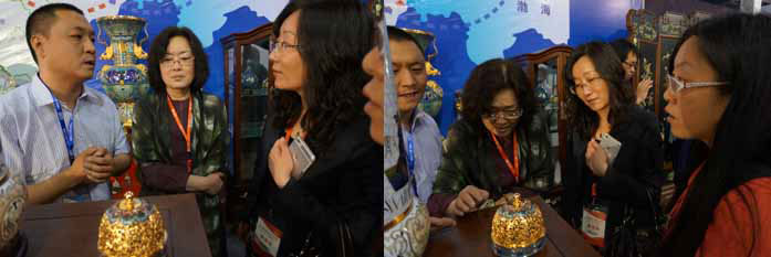 ??京銳景泰藍(lán)作為景泰藍(lán)的代表企業(yè),由公司總經(jīng)理徐國偉親自率團(tuán)參加了此次展會。開展當(dāng)日,文化部文化產(chǎn)業(yè)司副巡視員施俊玲等部司領(lǐng)導(dǎo)蒞臨廊坊展區(qū),肯定了廊坊市文化產(chǎn)業(yè)發(fā)展成績,對廊坊市文化創(chuàng)意產(chǎn)業(yè)發(fā)展提出了針對性建議。截至發(fā)稿,廊坊展區(qū)實現(xiàn)現(xiàn)場銷售額12萬余元,現(xiàn)場接到訂單60萬元。京銳景泰藍(lán)、大廠呈祥古典家具廠、文安韻迪樂器有限公司在江浙地區(qū)發(fā)展了代理商,為在江浙區(qū)域進(jìn)行市場開拓和業(yè)務(wù)發(fā)展打下了基礎(chǔ)。