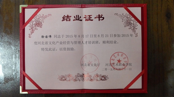 ? ? 2015年8月17日至8月21日,為深入貫徹黨的十八大精神,加強(qiáng)河北省文化產(chǎn)業(yè)經(jīng)營與管理人才隊(duì)伍的培養(yǎng),省文化廳將實(shí)施《文化產(chǎn)業(yè)經(jīng)營與管理人才隊(duì)伍培養(yǎng)平臺(tái)》提升工程,舉辦河北省第二期文化產(chǎn)業(yè)經(jīng)營與管理人才培訓(xùn)班,京銳景泰藍(lán)總經(jīng)理徐國偉參加了此次培訓(xùn)。