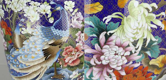 ? ? 在上面的構(gòu)圖對比當中,單不說左側(cè)劣質(zhì)的掐絲,層次不明的過渡,眾多明顯、粗大的砂眼,僅從構(gòu)圖上看,左側(cè)的飛鳥構(gòu)成明顯比右側(cè)的要粗略,細節(jié)部分刻畫粗糙,飛鳥呆滯無神;而右側(cè)京銳景泰藍作品上的飛鳥,羽毛層次錯落有致,眼睛生動傳神,顏色主次分明,過渡自然,細節(jié)處刻畫的更是相當精細,足見其工藝水平之高。