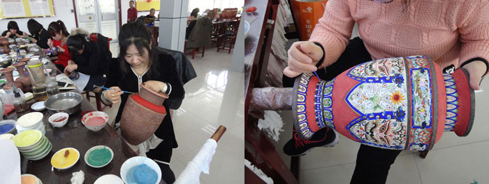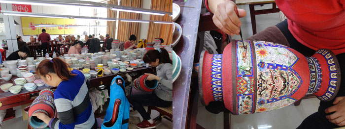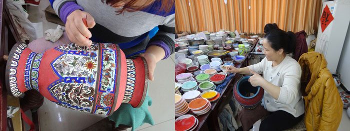 ? ? ③ “和平尊”的點藍:點藍用的釉料制作是以石英、長石、硼砂及一些礦物質(zhì)為原料加入多種貴重金屬著色劑,1400度高溫熔煉燒制而成。京銳景泰藍為此次“和平尊”的制作專門燒制了特殊的“中國紅”釉料。如果把掐絲比喻成繪畫中的線描,那么點藍就如同繪畫中的著色,所不同的是,點藍不是用畫筆,而是用藍槍、吸管;不是用色彩,而是用固體的釉料。點藍,強化了景泰藍工藝的特征,在流露著原始琺瑯工藝面貌的同時,間帶西亞風(fēng)韻,放射著景泰藍初始的光芒。