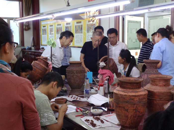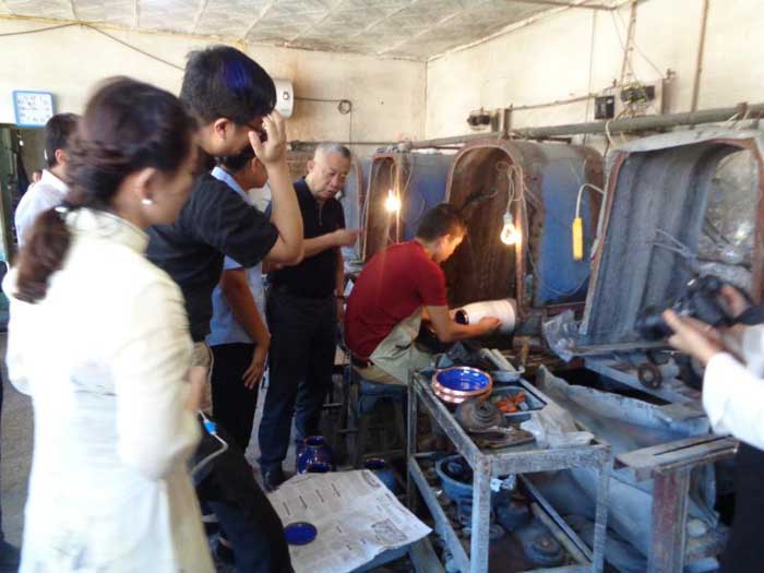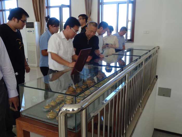 ? ? 考察團(tuán)一行一到京銳景泰藍(lán)公司,就對景泰藍(lán)的生產(chǎn)工藝表現(xiàn)除了濃厚的興趣,大家顧不上休息就直接來到生產(chǎn)車間。在工作人員的帶領(lǐng)下,大家依次參觀了打胎、掐絲、點(diǎn)藍(lán)、燒活、鏨活、平活、磨活等大小車間。在參觀的同時,工作人員給各位領(lǐng)導(dǎo)就各道大工序和部分重點(diǎn)小工序做了詳細(xì)的講解,眾位領(lǐng)導(dǎo)更是通過與技藝師傅們親切的交談,了解了景泰藍(lán)制作的繁雜??疾靾F(tuán)對景泰藍(lán)繁雜的純手工工藝感到震撼,同時對京銳景泰藍(lán)公司具備了在行業(yè)內(nèi)具備所有工藝生產(chǎn)能力表示贊賞。