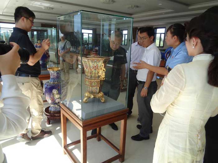 在參觀完工廠生產(chǎn)車間后,考察團(tuán)來到京銳景泰藍(lán)文化展示基地參觀,在“中國景泰藍(lán)皇家文化展示基地”三層參觀時,考察團(tuán)一行對眾多作品細(xì)細(xì)觀察、認(rèn)真揣摩??吹骄╀J景泰藍(lán)生產(chǎn)的件件產(chǎn)品都是藝術(shù)品時,各位領(lǐng)導(dǎo)對京銳景泰藍(lán)卓越的產(chǎn)品品質(zhì)發(fā)出了“這才是看到了真正的國寶藝術(shù)品景泰藍(lán)”的感嘆!在一些經(jīng)典大師作品前,駐足良久!