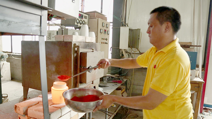 京銳景泰藍(lán)總經(jīng)理徐國(guó)偉親自制作釉料? 琺瑯釉料可分為有色、無色、透明、半透明、和不透明等五種,又依釉的組成可分為鉛釉及無鉛釉,由于年代久遠(yuǎn)我們已經(jīng)無法用現(xiàn)代科學(xué)語言來形容古代配方。在故宮典藏的文獻(xiàn)中詳細(xì)記錄了清代配置一斤琺瑯釉料的配方組成:馬牙石:十兩、定粉:八兩五錢、盆硝:八兩五錢、砒霜:一兩二錢、硼砂:三兩六錢、紫石:一兩五錢 。六樣加在一起正是三十三兩三錢。也就是說兩斤多原料才能熔制成一斤琺瑯釉料。這是因?yàn)樵谌壑片m瑯釉料的過程中一部分原料變成氣體揮發(fā)了,起最主要基體作用的是馬牙石也就是(石英、二氧化硅)這種材料,其他的比如說:盆硝、定粉、硼砂是起到助熔作用。紫石(我們常說的螢石—氟化鈣)和砒霜(三氧化二砷)在配方里起到澄清劑和乳濁劑的作用。再用金屬原料來配置顏色,如寶石藍(lán)是加入鈷的氧化物,高溫熔煉出的藍(lán)色;加入黃金可以調(diào)試出美妙的粉紅色。經(jīng)過京銳公司的不斷創(chuàng)新和研發(fā),琺瑯釉料配方趨于專業(yè)化和科學(xué)化,實(shí)現(xiàn)了高溫熔化,使釉料原材料在恒定的溫度下保持穩(wěn)定的化穩(wěn)性。