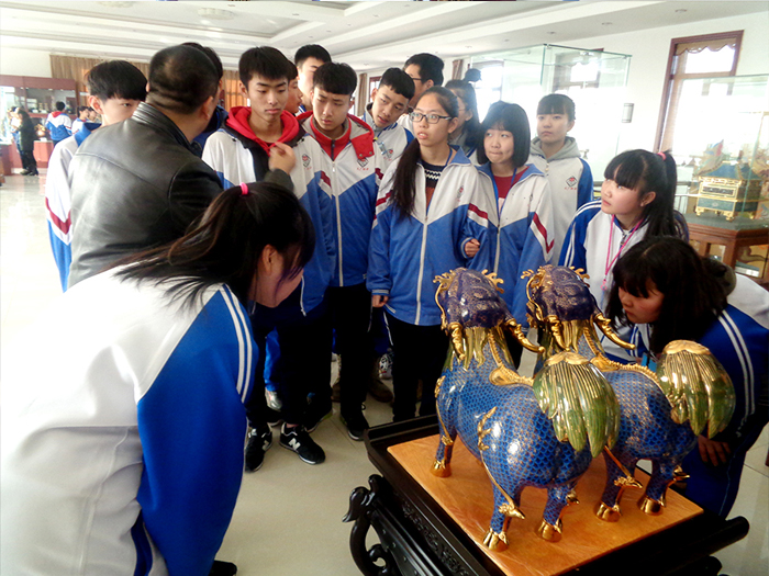 ? 京銳景泰藍(lán)總經(jīng)理徐國(guó)偉,為眾多學(xué)生詳細(xì)介紹了一些大師精品的名稱(chēng)及其內(nèi)涵,眾多學(xué)生被這些歷經(jīng)千錘百煉才完成的精美藝術(shù)品深深吸引。色彩斑斕與華麗多姿,已經(jīng)成為他們心目中景泰藍(lán)的代名詞。