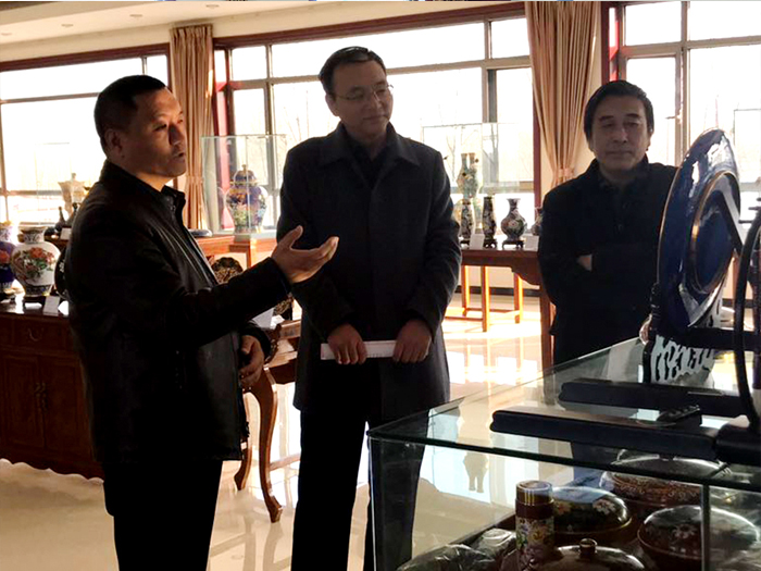 京銳景泰藍(lán)總經(jīng)理徐國(guó)偉為非遺領(lǐng)導(dǎo)介紹景泰藍(lán)大師精品,張向東大師陪同