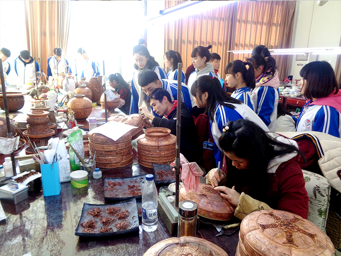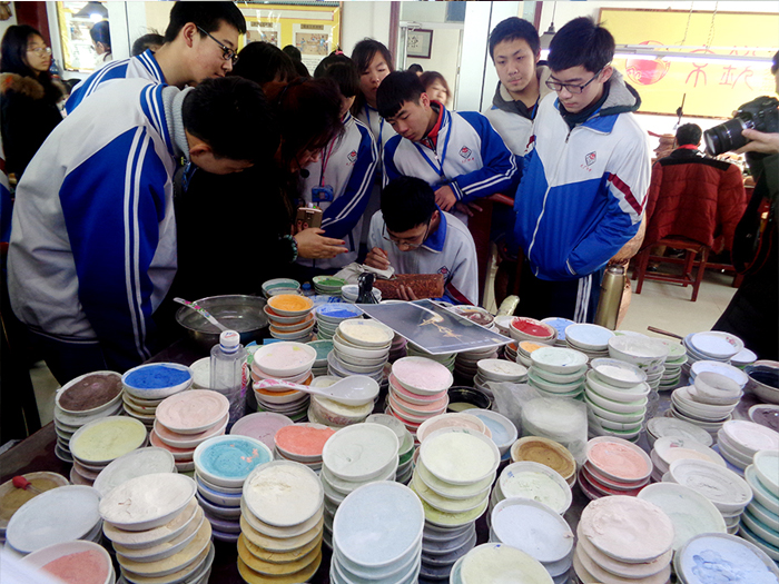 眾多學(xué)生觀察工藝師傅們的操作——景泰藍(lán)工序掐絲
