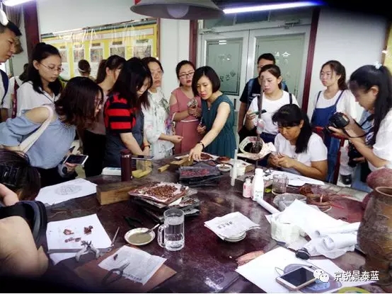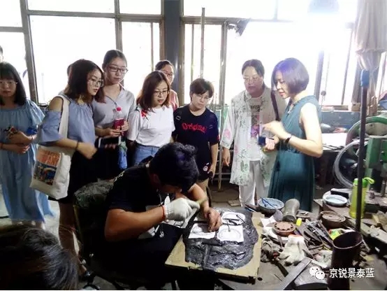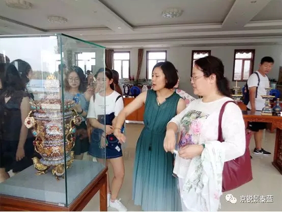 ? 2018年7月7日,暑假已如期而至,河北經(jīng)貿(mào)大學(xué)工商管理學(xué)院文化產(chǎn)業(yè)管理系開(kāi)展了“非遺文化暑期實(shí)踐”活動(dòng)。文廣新局郭靖凡局長(zhǎng)和河北經(jīng)貿(mào)大學(xué)工商管理學(xué)院文化產(chǎn)業(yè)管理系主任劉景枝教授帶領(lǐng)文化產(chǎn)業(yè)管理系的學(xué)生,來(lái)到京銳景泰藍(lán)深入了解學(xué)習(xí)景泰藍(lán)的制作流程和背景文化。京銳景泰藍(lán)總經(jīng)理劉芳陪同并為眾位師生做了詳細(xì)講解。