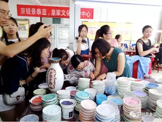 ? ?同學(xué)們都積極踴躍的想感受一下景泰藍(lán),于是劉總安排了兩個(gè)工位讓每位感興趣的同學(xué)都可以親手體驗(yàn)一下景泰藍(lán)的美妙,并親自指導(dǎo)示范點(diǎn)藍(lán)的精華所在——潤(rùn)色的技巧。