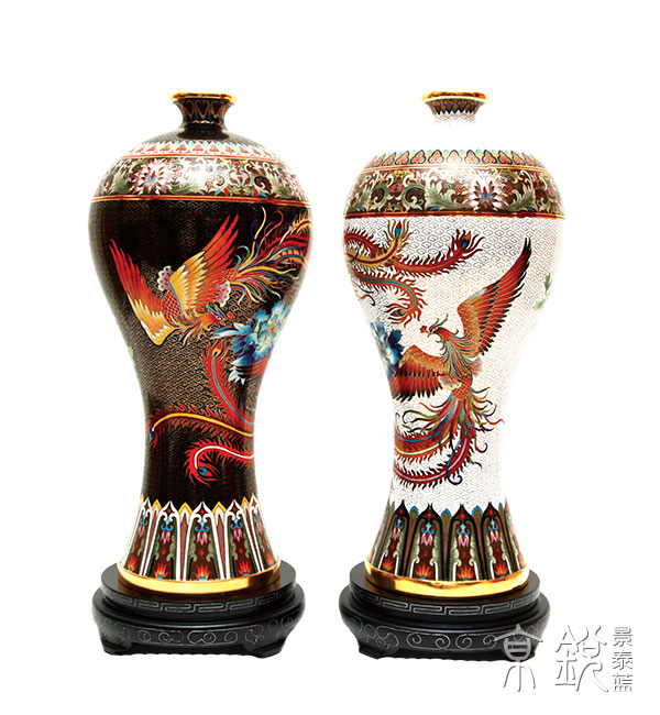 ? ? 《喜鳳瓶》創(chuàng)作于2005年,是景泰藍(lán)第一人張同祿大師創(chuàng)作的景泰藍(lán)藝術(shù)精品,作品共有白、藍(lán)、黑三種底色,以象征福瑞的百鳥(niǎo)之王鳳凰和象征富貴的百花之王牡丹為主題,雙鳳環(huán)繞雍容華美的牡丹花翩翩起舞、互相追逐,一派喜慶景象,含有雙鳳呈祥、花開(kāi)富貴之意。鳳凰長(zhǎng)尾隨風(fēng)而擺,飄然如瀑,其色彩之絢麗,如虹勝霞,其雙翼之鳳羽層層疊疊云排而上,一曲一放張合有度,其曲者蓄勢(shì)萬(wàn)鈞,放者揮灑如云,有乘風(fēng)而上之勢(shì)。整體瓶型婉轉(zhuǎn)清秀、優(yōu)美動(dòng)人,如月夜之下翩然起舞的絕代佳人。
