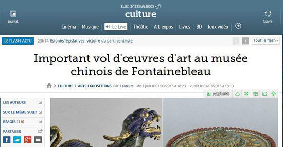 ? ? 另據(jù)東方網(wǎng)記者方翔3月2日?qǐng)?bào)道:據(jù)外電報(bào)道,在當(dāng)?shù)貢r(shí)間星期日,法國(guó)楓丹白露宮內(nèi)的多件重要文物被盜,其中就包括來自圓明園的文物珍品。
