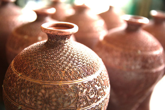 ? ?胎型是景泰藍(lán)制作的第一步,制胎是掐絲的前奏。根據(jù)產(chǎn)品胎型的要求,將加工過的紫銅板按圖下料,裁剪出不同形狀,用鐵錘敲打制成形狀各異的銅胎。