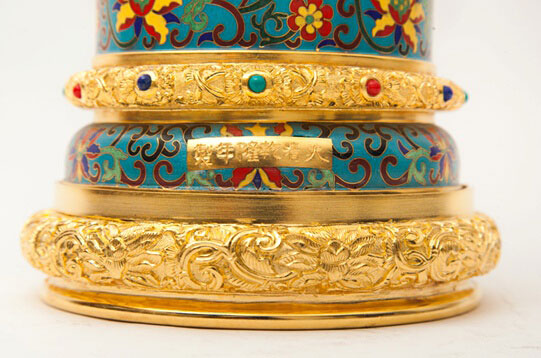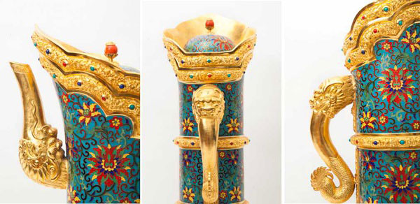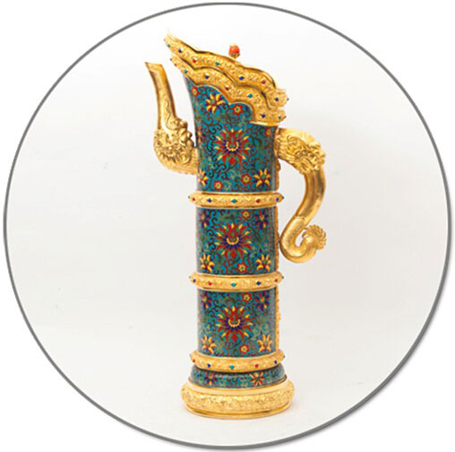 ? ? 壺圓筒形狀,僧帽口,龍柄,龍流,蓋頂嵌珊瑚珠為紐。在鏨刻鍍金的口沿、橫箍和底座上嵌有多色寶石,整體流光溢彩、富麗堂皇。