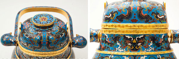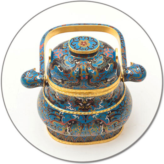 ??? 卣為商代盛酒器。此卣造型仿古青銅器,制作精美,工藝細(xì)致,無論掐絲、釉色還是磨工、鍍金等,都足以反映出清中期掐絲琺瑯工藝水平之精湛。