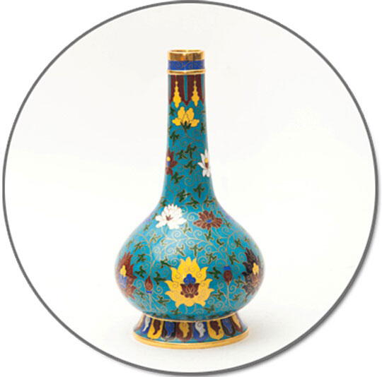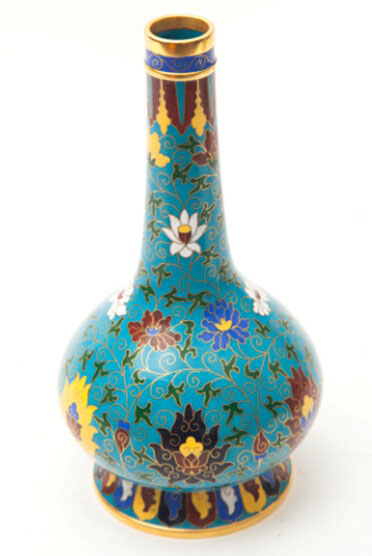 ? ? 瓶直口,長頸,垂腹,圈足。通體以淺藍(lán)色琺瑯為地,飾掐絲填紅、寶石藍(lán)、黃、白(硨磲白)等色琺瑯釉的纏枝蓮花紋。足內(nèi)鐫刻楷書“宣德年制”四字款。