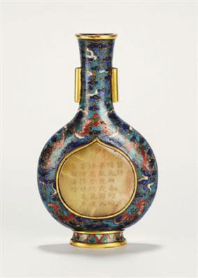 清乾隆,銅胎掐絲琺瑯嵌玉御題詩壁瓶》:精銅為胎,掐絲琺瑯為飾。貫耳瓶造型。圓唇口,長頸,溜肩,鼓腹,圈足。頸部置雙貫耳。腹部壽桃形開光,嵌白玉一塊,上陰刻楷書御制詩一首:“隔歲相看灼灼姿,風(fēng)光宛爾入評思。含胎莫道春猶淺,好是不曾爛漫時”。輪廓邊線、貫耳及背面飾金彩,金色燦爛。余以掐絲琺瑯飾云蝠紋,寓意洪福齊天,為清宮造辦處精品。在故宮三希堂中,可見墻壁處掛有多件壁瓶,而三希堂中壁瓶仍以瓷器居多,此件壁瓶以銅胎琺瑯為主體,鑲嵌以白玉,可見等級之高。(劉霞)