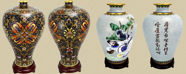 ? ? 上圖中我們可以看出景泰藍(lán)太白瓶整體是以白色為底色,而且色調(diào)多較集中、成片,而梅瓶是以褐色為底色,而且底色分為上下深淺兩種褐色,中間還夾雜很多黑色,色調(diào)比較分散,不能連接成片,這樣的點(diǎn)藍(lán)更加需要費(fèi)時(shí)間和精力,從而造成了景泰藍(lán)價(jià)格上的差別。