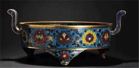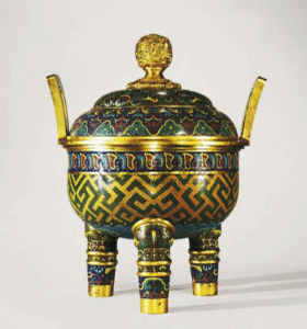 三、2006年在香港蘇富比,清乾隆銅胎掐絲琺瑯回紋三足蓋鼎以725.04萬元拍出。