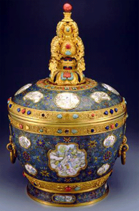 六、2008年中貿(mào)圣佳拍賣公司春季拍賣會上,一對高28厘米的清乾隆“掐絲琺瑯多穆壺”以9072萬元人民幣成交。